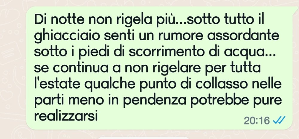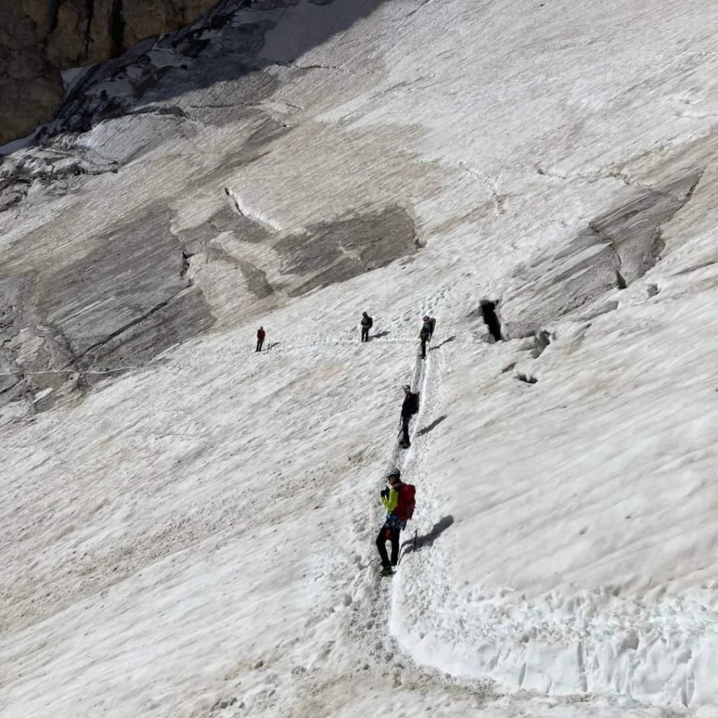 Provo a farla breve. Siamo fortunati, noi del Cai di Piacenza, in quell’estate strana del 2022, molto fortunati. Anzi abbiamo proprio culo. Lo stato del ghiacciaio è pessimo, scuro oltre che ridotto, crepacci apertissimi già ad inizio stagione con neve marcia già poco dopo l’alba. Il tutto rende difficile l’attraversamento dei pochi ponticelli disponibili e costringe a salti ampli tra un lembo e l’altro delle crepacciate. Arriviamo poco dopo la metà della mattinata a Punta Penia e nonostante gli oltre 3300 metri e il vento forte siamo a 12 gradi sopra lo zero. Durante il passaggio sul ghiacciaio sottostante sento acqua di ruscellamento in ogni centimetro quadrato. Così mando un messaggio ad Alberto De Giuli.