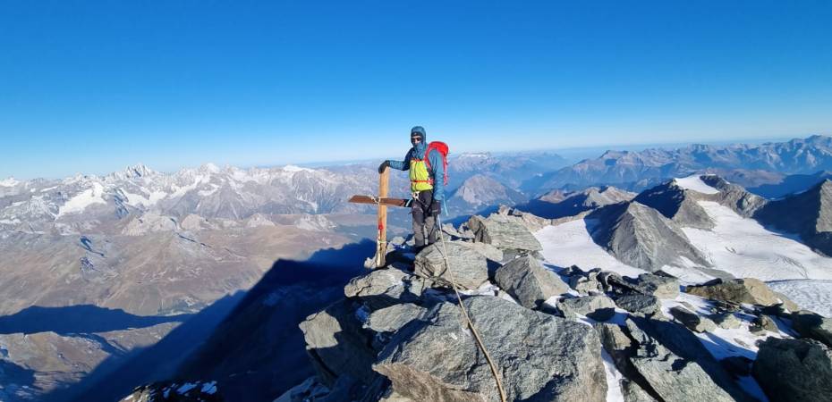 Più avanti, a Luglio, proprio con Alberto De Giuli, decidiamo di fare il primo 4000 di stagione: il Dente del Gigante. L’avventura non è semplice: è tutto secco e al Rifugio Torino dove pernottiamo dopo un giorno di acclimatamento attivo (con la cresta dell’Entreves) ad ora di pranzo si superano i 10 gradi e i turisti, saliti con la funivia della Skyway, prendono il sole sulle sdraio come fossero al mare. Alberto il giorno della vetta è nervosissimo. Ci credo !