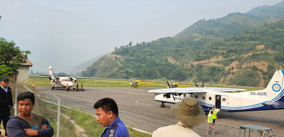Non c’è avventura, soprattutto quelle che si svolgono in questi ambienti che se pur divenuti turistici e antropizzati hanno a che fare sempre con gli elementi della natura, che non comporti la possibilità che quache cosa di imprevisto non si realizzi. Il giorno 2, quello che si sta per concludere, avrebbe contemplato infatti il trasferimento da Kathmandu a Lukla, verso la porta dei campi base himalaiani, dapprima in aereo. Ma le notizie che rimbalzano dall’agenzia la Seven Summit, sono quelle, causa una precedente finestra di maltempo, di una fila di alpinisti in attesa di imbarcarsi di 24-36 ore. Si opta, dunque, per l’elicottero da prendere presso il Ramechhap airport un piccolissimo scalo a 4 ore di auto da Kathmandu.