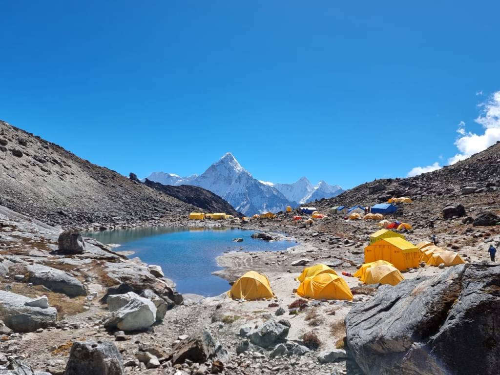Come il diario pubblicato su questo blog ha cercato di illustrare, tecnologia permettendo, è andato tutto per il meglio sino alla giornata della salita all’Everest Base Camp. Mi sentivo molto bene fisicamente: durante il cammino anche coi dislivelli maggiori ero ampiamente davanti a tutti i componenti dell’allegra brigata e persino ad alcuni dei nostri sherpa nepalesi: il training aveva dato i suoi frutti. Naturalmente mi aspettavo, così come è poi succssso, che i rapporti si sarebbero invertiti tra noi e i portatori ma soprattutto gli sherpa: noi in corso di acclimatamento loro acclimatati per abitudine a queste altezze e forse anche per genetica. Da quella giornata in poi, meglio da quella nottata in poi, tutto è cambiato, in peggio per il mio fisico. Purtroppo, come altri della combriccola, sono stato colpito da un raffreddore-influenza che a 5000 metri e più mi hanno lasciato in tre notti solo 6 ore di riposo. Nonostante tutto sono salito al campo base avanzato per il Lobouche Peak. Senza alcuna ulteriore ora di riposo nella tenda e in condizioni pessime all’una della notte ho deciso, poi, di rinunciare a partire per la vetta.